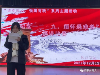 时逢第八个国家公祭日,为纪念“一二·九,缅怀遇难者”爱国运动,同时缅怀遇难同胞,激励我院学生的爱国激情,弘扬伟大的爱国精神。体育学院于12月13日以“朗诵点滴历史,演讲爱国情怀”为主题举行“纪念一二·九,缅怀遇难者”演讲比赛。